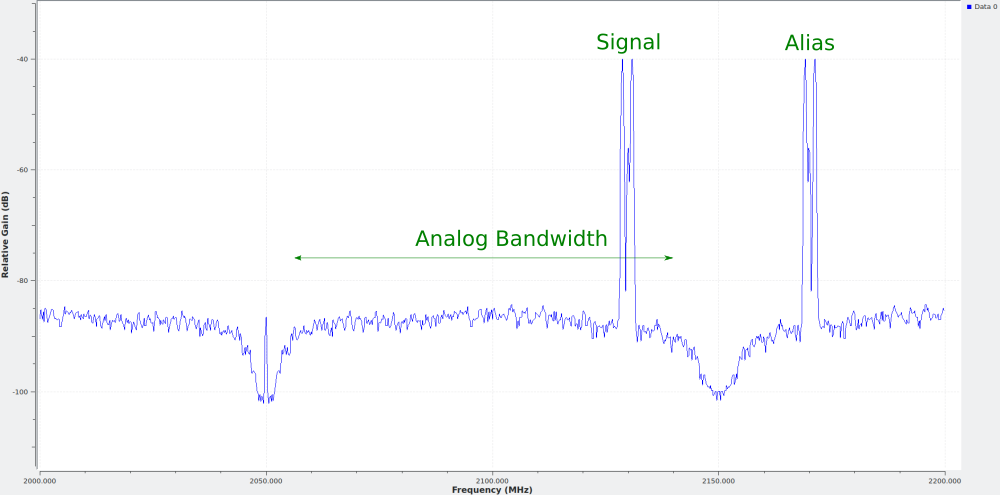 Starting with UHD release 4.1, the X310/X300 FPGA images no longer contain a halfband anti-aliasing filter directly after the ADC when using TwinRX. The filter was left out because the radio no longer decimates the sampling rate for TwinRX, instead relying on the DDC RFNoC block to adjust the sampling rate, and the DSP utilization of the filter was permanent, even when no TwinRX daughtercard was used. This means the output of the radio block (which produces a 200 Msps output signal when using TwinRX) contains aliases of the signal. The following image shows the output of the X310+TwinRX when configuring it to run at 200 Msps. The center frequency is set to 2.1 GHz, and a signal is applied at approx. 2.13 GHz.